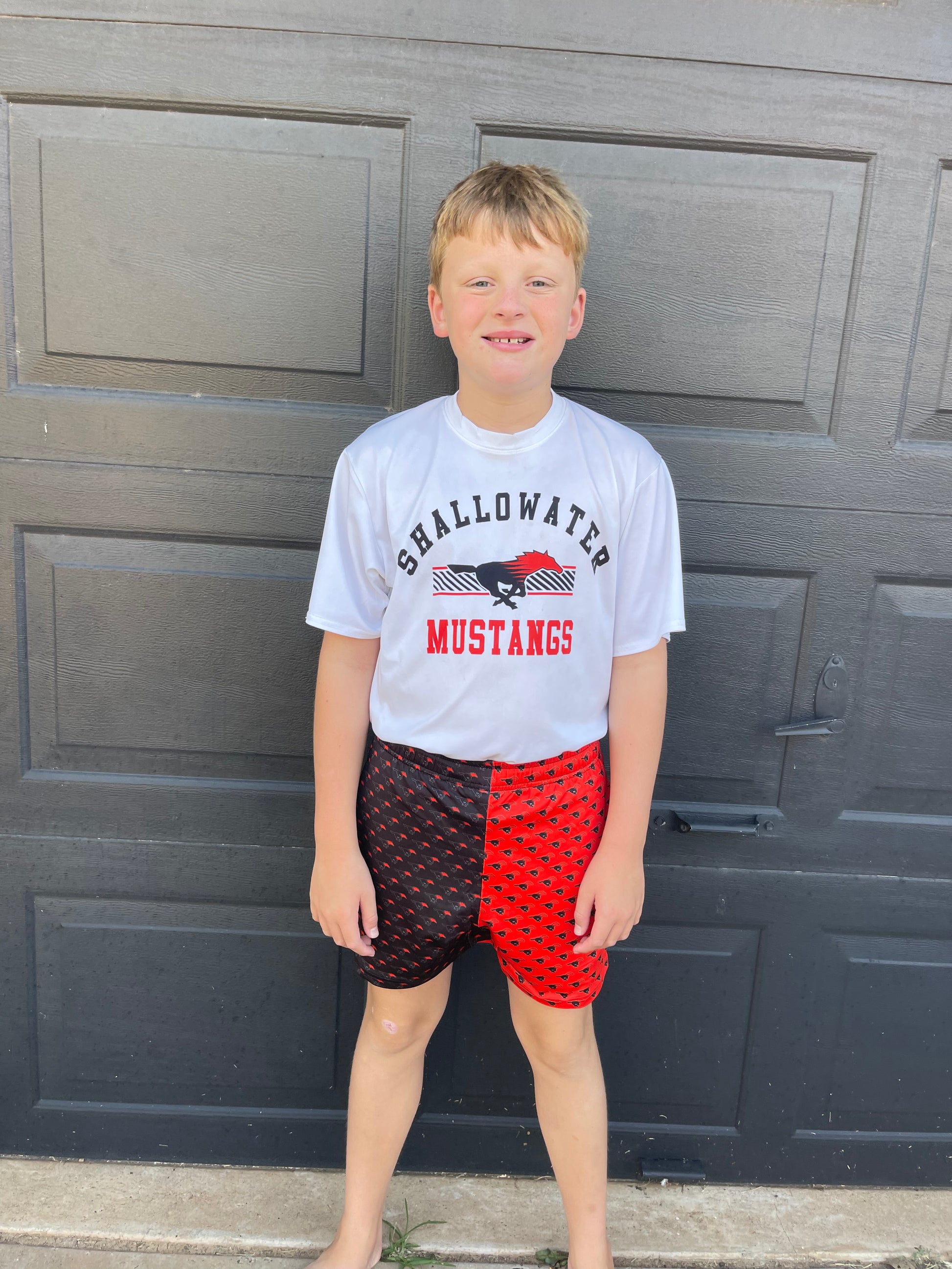 Mesh, drawstring shorts. Runs a little smaller in length; size up if needed.