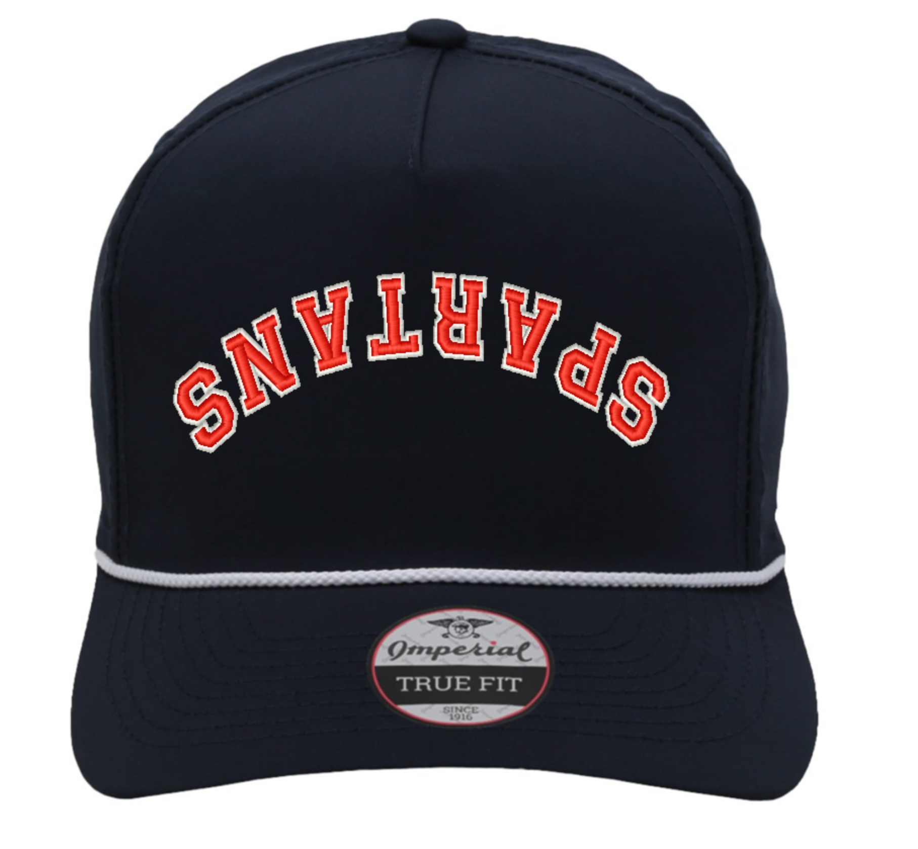 Black structured polyester rope hat. Mid-profile. Embroidered with white underlay and red lettering.